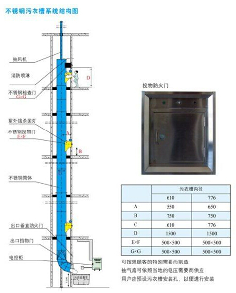污衣井是采用進(jìn)口優(yōu)質(zhì)不銹鋼加工焊接而成。槽管以角形圓環(huán)接口結(jié)合,允許各層樓的槽管在高度上的尺寸和冷縮熱脹的情況。在每一層樓,槽管以鍍鋅鐵地臺固定架支承,并用螺栓錨固于地臺上。污衣井在所需的樓層提供的投物門為側(cè)鉸、雙層門,可以加配電控門鎖,也可以人手操作。